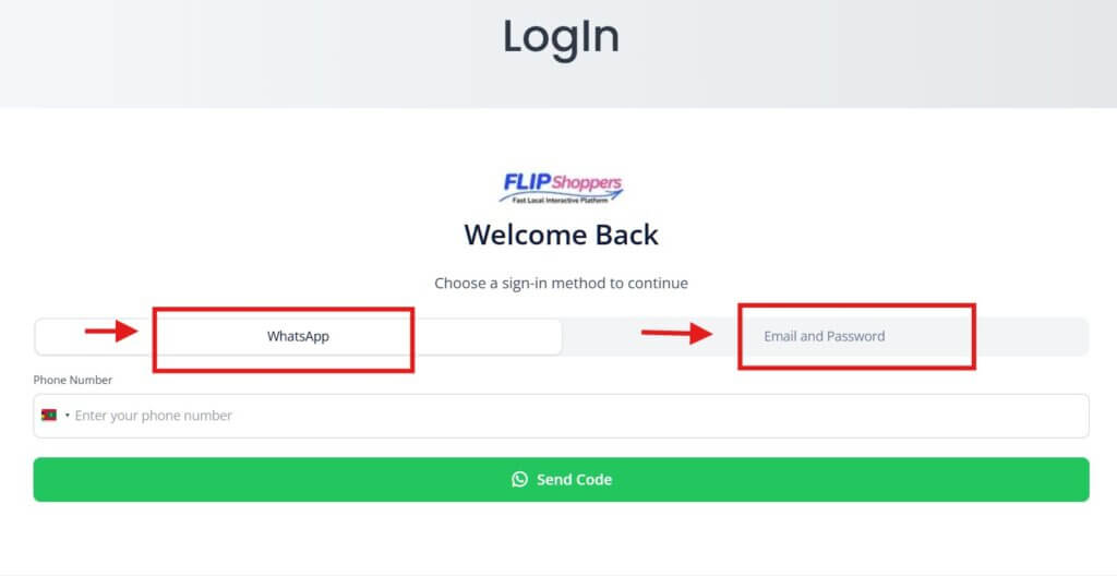 Enter your WhatsApp number to log in, or use your email ID and password.